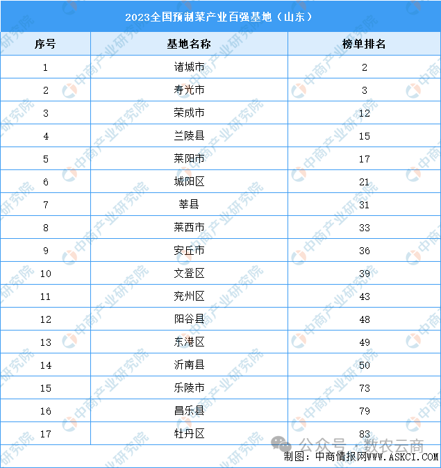 《2023預制菜產業基地百強研究》報告顯示,山東省17個基地入選百強榜單,排名第一。其中,諸城市、壽光市進入榜單前三,分別排名第二和第三。