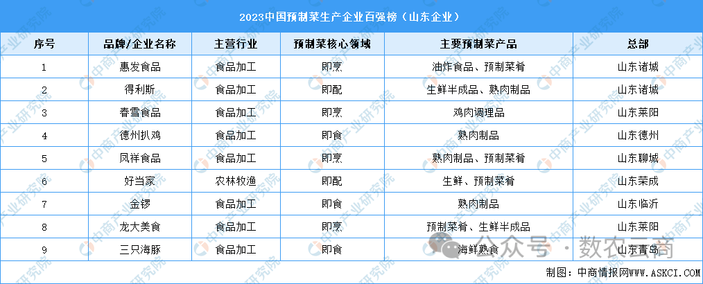 《胡潤中國預制菜生產企業百強榜》中,山東有9家企業上榜。其中,萊陽、諸城各有2家企業,德州、聊城、臨沂、青島、榮成各1家企業。