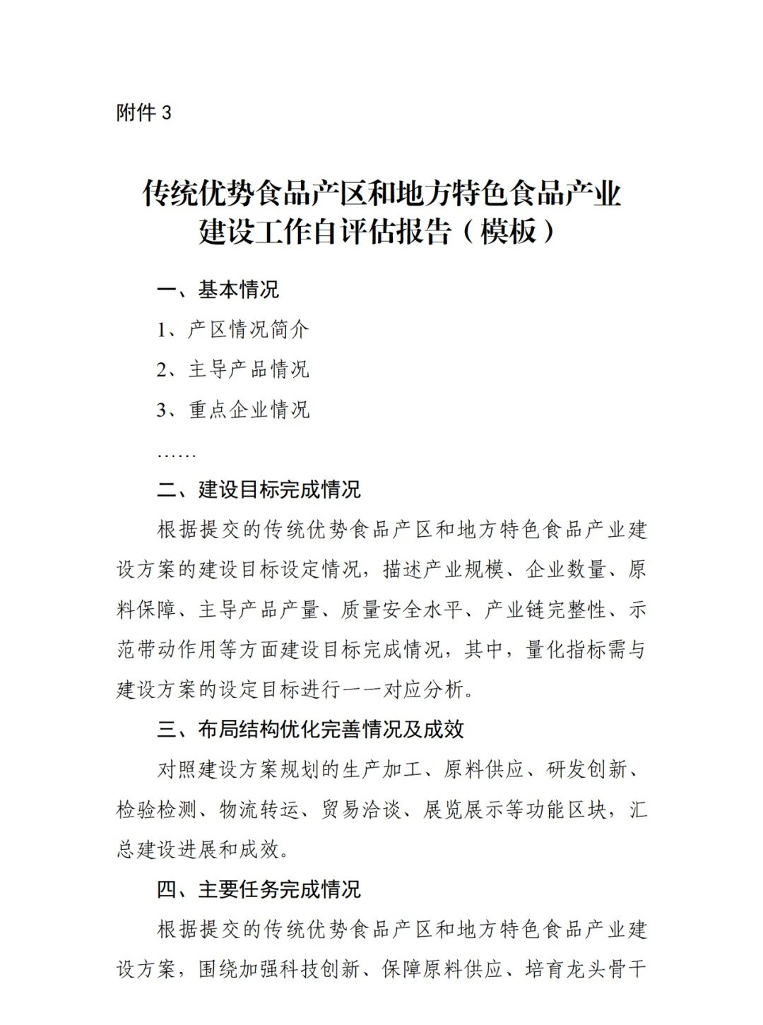 開展復評工作時,由產區(產業)申請單位提交復評材料,包括近3年建設工作自評估報告(模板見附件3)、《傳統優勢食品產區和地方特色食品產業重點培育名單申請書》、新一輪3年周期的《傳統優勢食品產區和地方特色食品產業培育工作方案》。