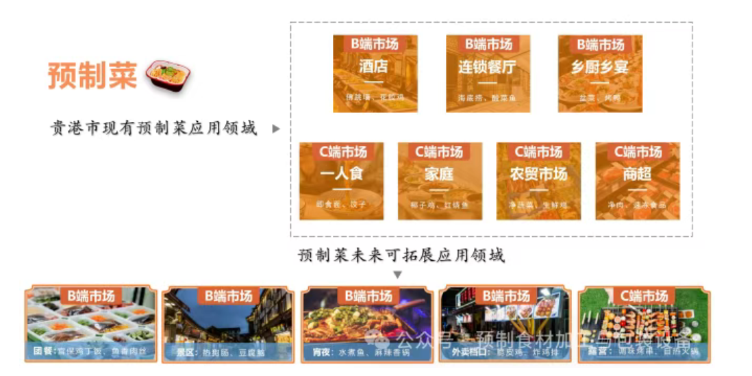 目前貴港市預制菜行業在一人食、家庭、商超、農貿市場、鄉廚鄉宴、連鎖餐飲、酒店等B、C 端市場均有所開拓,但體量較小、不成規模,團體、個人等消費終端需求有待培育。