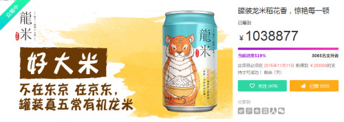 2016年姜豐眾籌上線了“龍米”,短短22天金額就一路飆升至128萬元,遠遠超出原定的20萬元眾籌目標。
