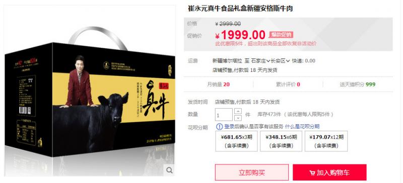 “崔永元真牛”均為禮盒裝,目前有兩種規格:4.5 千克,699 元,每公斤超150 元;5.5 千克,1999 元,每公斤超 360 元。