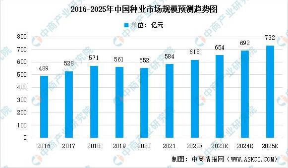 我國種子行業發展起步較晚,種業市場空間巨大。根據Kynetec數據顯示,2020年我國種業市場規模達552億元,過去5年年均復合增長率2.3%,市場規模居全球第二。預計2025年市場規模將達732億元,年均復合增長率5.8%,市場增速明顯高于世界其他主要農產地區,增長潛力較大。