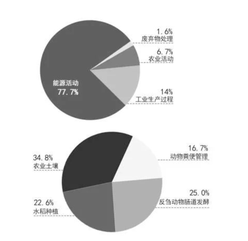 當前國內農業碳排放最新數據是2018年生態環境部提交的《中華人民共和國氣候變化第二次兩年更新報告》,報告顯示2014年我國碳排放總量約為123億噸二氧化碳當量(CO2e),農業活動碳排放總量為8.3億噸CO2e,占全國碳排放總量的6.7%。主要來源于動物腸道發酵、動物糞便管理、水稻種植、農業土壤和農業廢棄物田間焚燒。從產業領域看,種植業排放占58.4%;養殖業排放占41.6%;從氣體組成看,甲烷排放占農業總排放的56.2%,氧化亞氮排放占農業總排放的43.8%。本文研究數據均不包含土地利用變化和林業吸收碳匯數據。