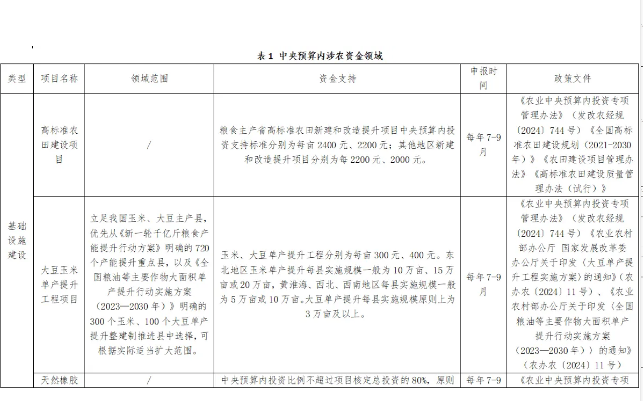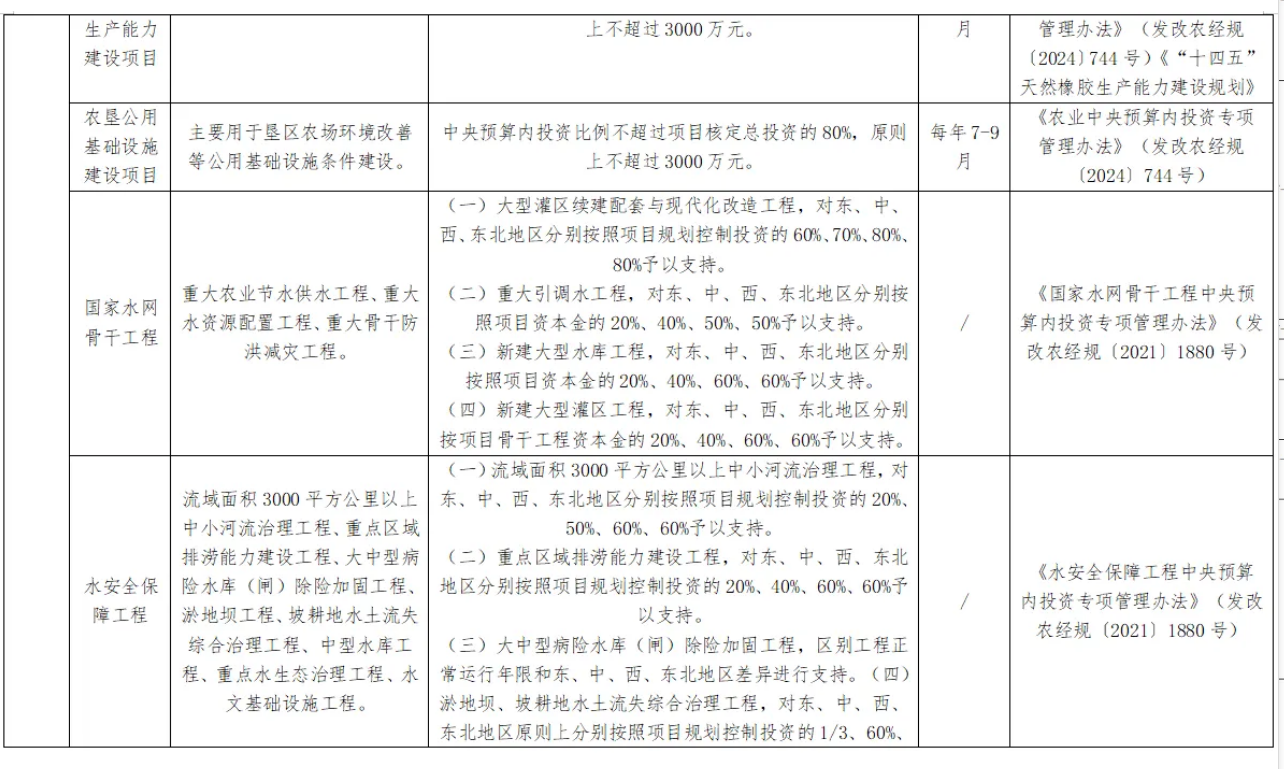 項目謀劃方向為高標準農田建設、大豆玉米單產提升工程、天然橡膠生產能力建設、農墾公用基礎設施建設、國家水網骨干工程、水安全保障工程、農村電網鞏固提升工程的等項目。
