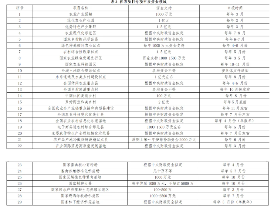 重大農業專項主要以農業部及相關部委扶持的重大項目為重點,項目謀劃方向為農業產業強鎮、現代農業產業園、優勢特色產業集群、農業現代化示范區、國家鄉村振興示范縣、綠色種養循環農業試點、農村綜合性改革試點、水系連通及水美鄉村建設試點、農村產業融合發展示范園等項目。