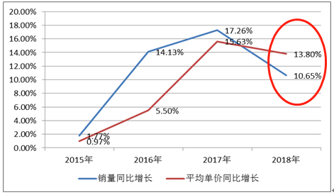 從銷量與單價增速看,2018年單價增速首次超過銷量增速。
