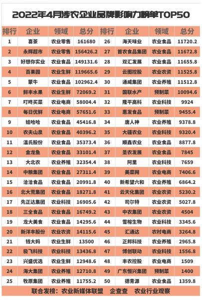 (2022年4月中國涉農(nóng)企業(yè)品牌影響力榜單TOP50)