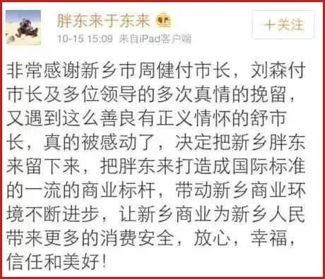 據悉,當年新鄉胖東來要撤店時,新鄉萬人去正門請愿,求胖東來留下來。用于東來自己的話說,是在各方的挽留下,他才保留了新鄉的店。
