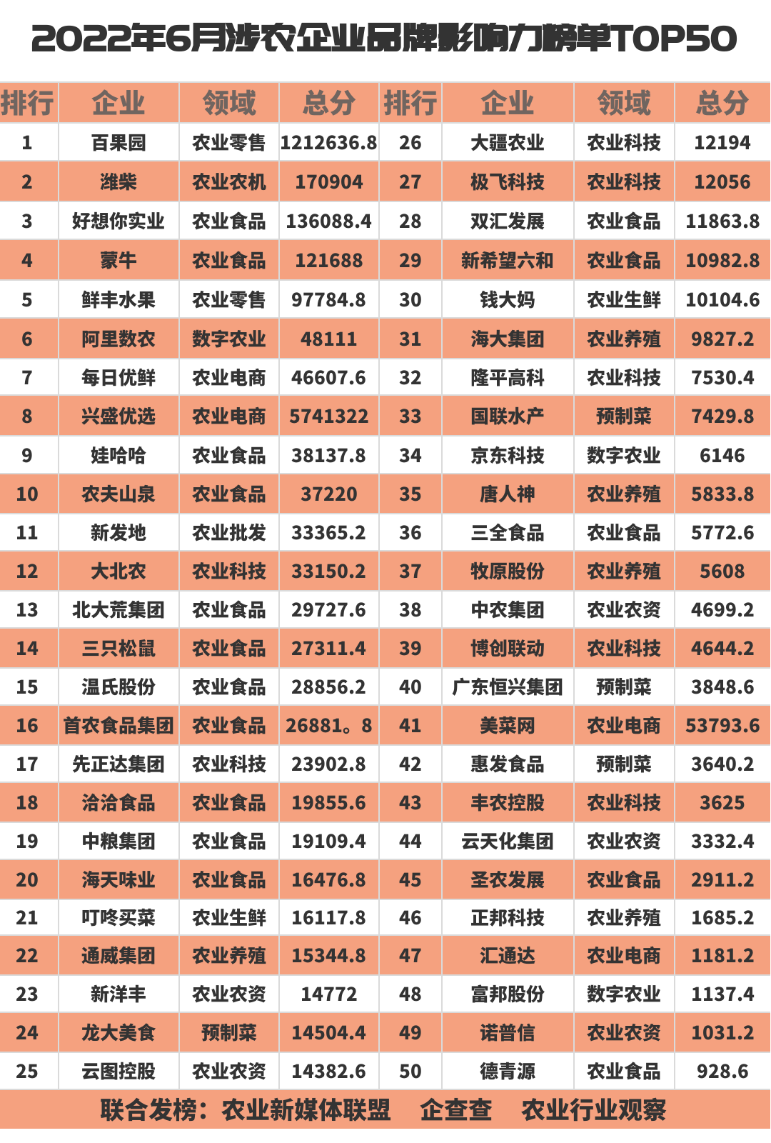 最近,農業新媒體聯盟、企查查、農業行業觀察聯合發布了《共譜鄉村振興·中國涉農企業品牌影響力榜單TOP50(第六期)》,在50多家涉農企業的品牌輿情監測、自媒體運營、搜索引擎數據及口碑影響力排名結果中,百果園、濰柴、好想你實業摘得榜單前三名,另外,前十名中均來自農業食品、農業電商、農業科技、生鮮等細分賽道,比如,蒙牛、鮮豐水果、阿里數農、每日優鮮、興盛優鮮、娃哈哈、農夫山泉等品牌紛紛入榜。