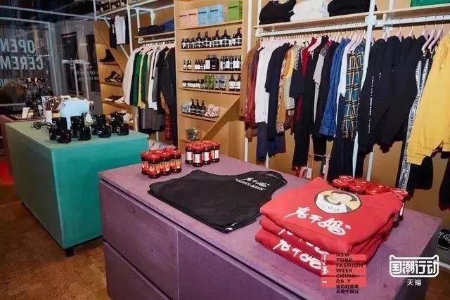 另外,緊接著9月9日至9月11日,天貓國潮行動聯合全球頂尖潮流買手店Opening Ceremoney 打造了中國日“天貓國潮廠牌店”,目的是為一系列獨居中國文化基因的品牌定制潮流跨界單品。其中入駐品牌最引人矚目的非“老干媽”莫屬。