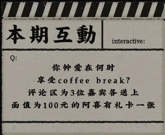 在“全新喜茶咖啡,今日買一送一”這篇電影風格的推文中。文末是關于你鐘愛在何時享受咖啡的問題,禮物則是與這篇推文風格一致的阿喜有禮卡一張。