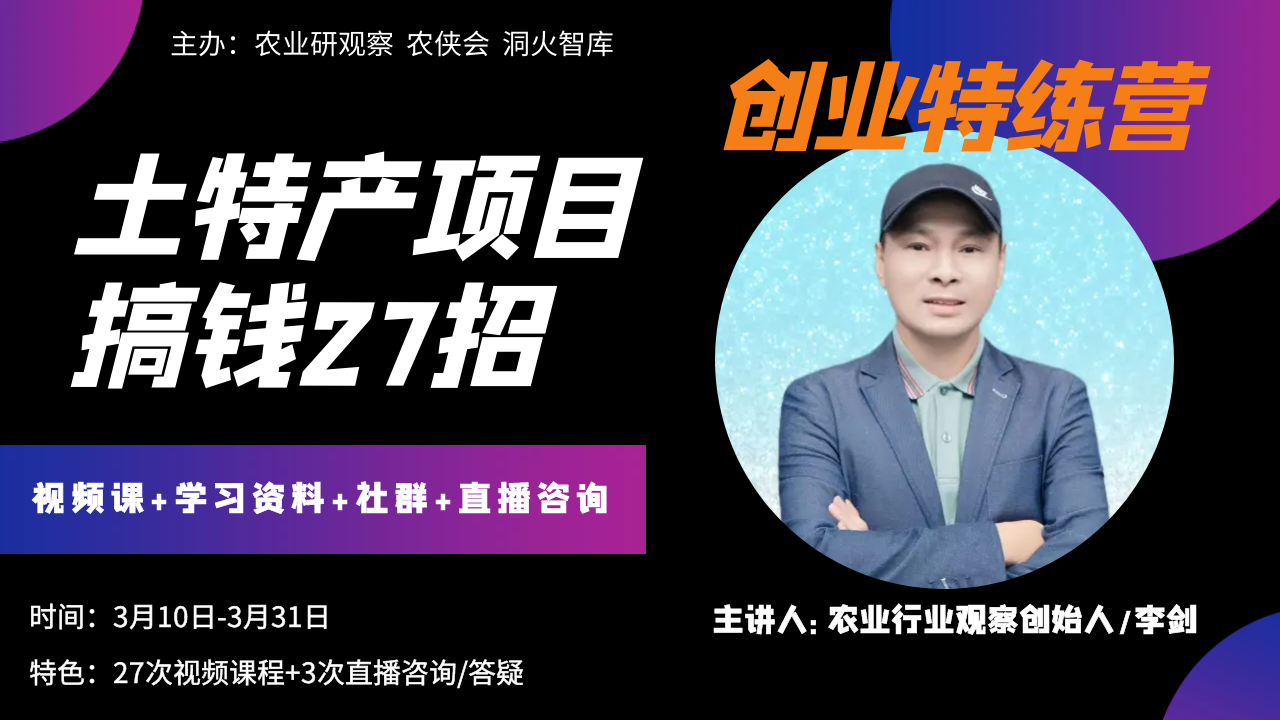 3月10日-3月3月31日 農業行業觀察&農俠會、洞火智庫推出一套系列土特產創業經營特訓營課程(直播課),涵蓋土特產產品、品牌、商業、模式等課程采用視頻的方式幫助土特產老板或經營者、管理者、創業者如何利用新模式、新思維、新商業搞錢,助力老板、創業者認知升級、思維升級。