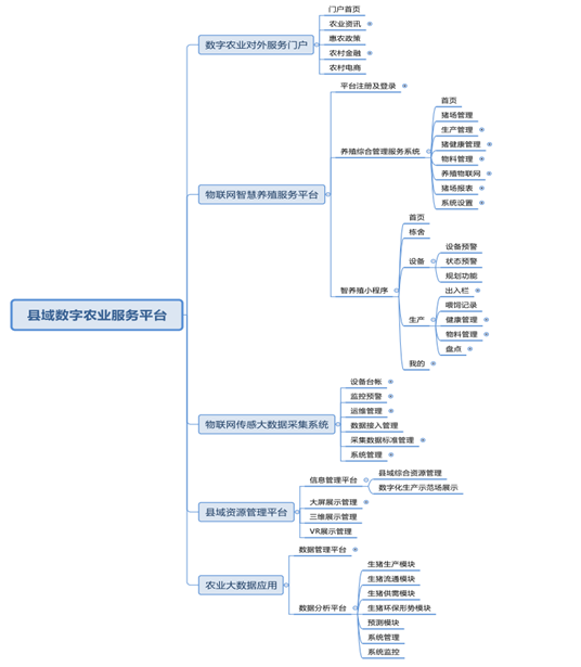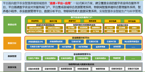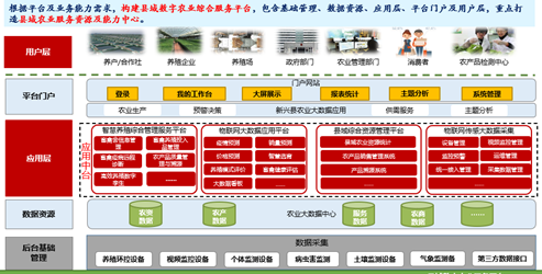 縣域數字農業綜合服務平臺(取得一定成果,已經在試運行階段)由數字農業對外服務門戶、物聯網智慧養殖服務平臺、物聯網傳感大數據采集系統、縣域綜合資源管理平臺、農業大數據應用平臺組成。