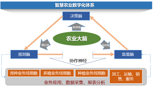 規劃腦:規劃采集相關數據,部署相關設備。對基礎設施的規劃,實現對整個業務流程循環不斷的迭代和升級,逐步提升數字農業的發展水平。