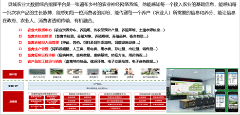 縣域農業大數據綜合指揮平臺是一張遍布鄉村的農業神經網絡系統,他能感知每一個接入農業的基礎信息,能感知每一批次農產品的生長脈搏,能感知每一位消費者的期盼,能傳遞每一個養戶(農業人)所需要的信息和養分、能讓信息在政府、農業人、消費者透明傳輸,有機融合。