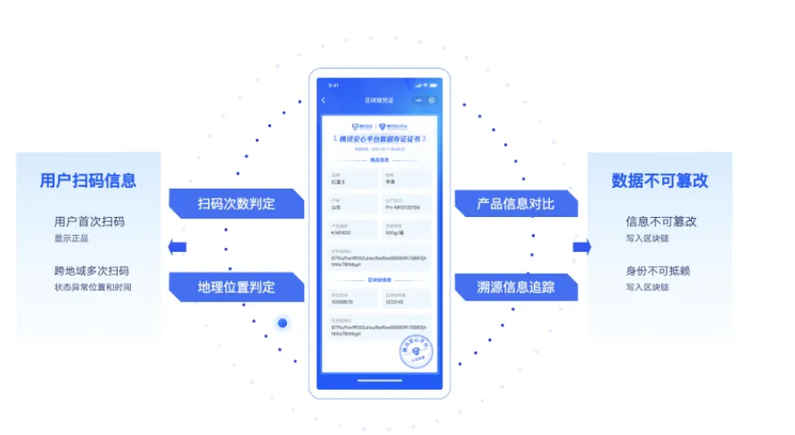 騰訊安心平臺是騰訊安全正式對外發布的戰略新品,平臺以碼為載體,通過“碼鏈溯源+碼后營銷+品牌監控+品牌建設”為產業客戶構建一套完整的數字化基礎設施。平臺基于騰訊一物一碼、區塊鏈等前沿技術不可篡改性,構建農產品體系溯源系統,為優質農產品做品牌背書,使每一件商品都能夠定制專屬“身份證”,讓商品全流程“來源可追、去向可查”,增益品牌價值,降低消費者鑒別商品門檻,助力市場監管升級,同時依托騰訊積累的權威媒體矩陣為農產品做品牌營銷,增加了其在市場上的競爭力。