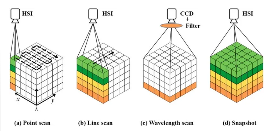 圖4 高光譜數據采集的不同模式。(a) 點掃描、(b) 線掃描、(c) 波長掃描和 (d) 快照掃描。