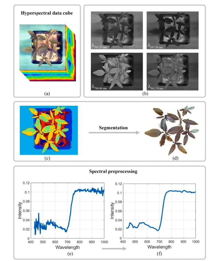 圖6 (a) 高光譜數據立方體的可視化;(b) 不同波長的高光譜圖像;(c-d) 使用 k-均值聚類進行基本分割過程以去除背景;(e) 顯示原始作物光譜特征;(f) 以Savitzky Golay二階導數預處理為例,展示了預處理后的相同光譜特征。