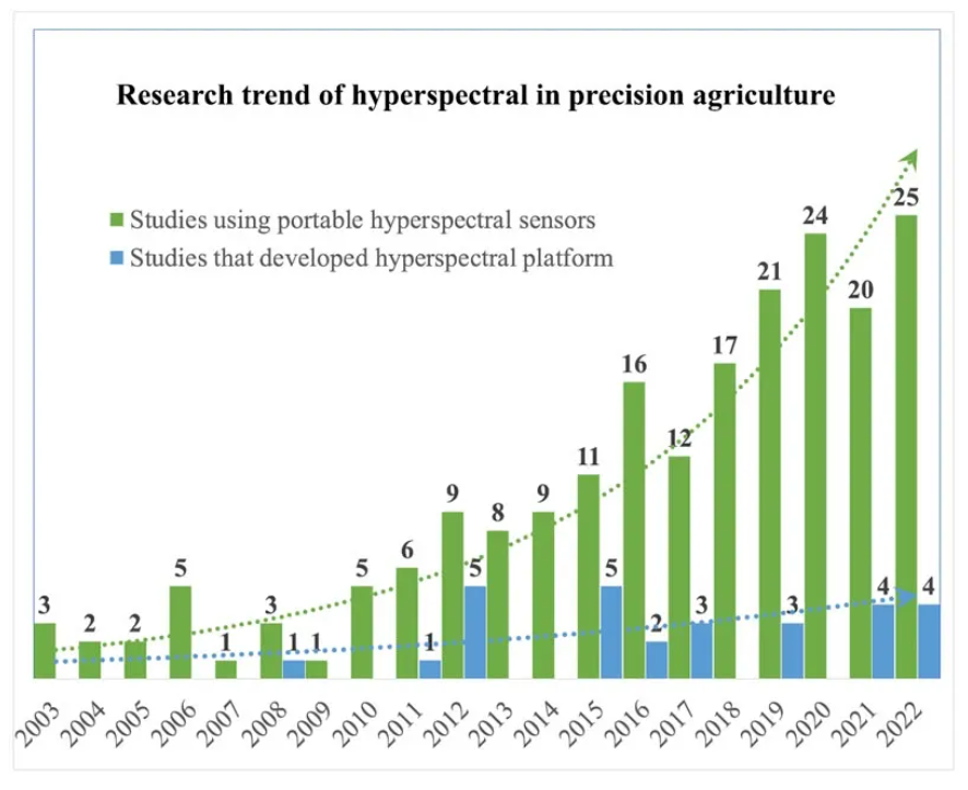 圖1 同行評審出版物中的研究趨勢顯示,使用手持式高光譜傳感器和定制平臺進行高光譜數據采集或分析的研究呈上升趨勢。