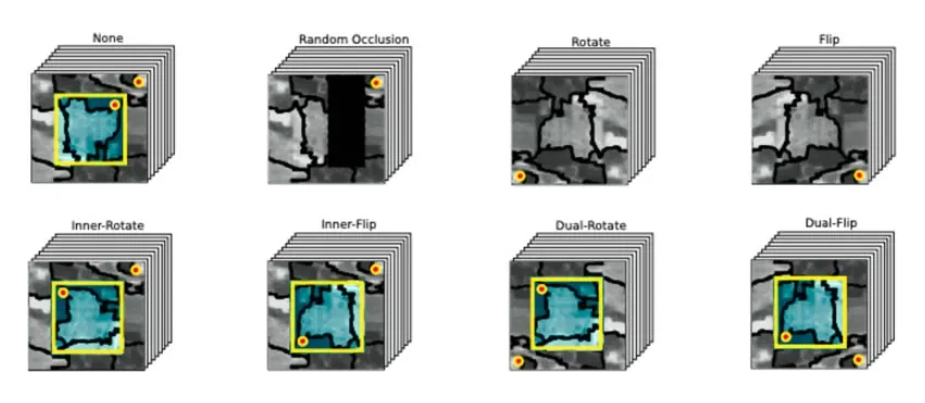 圖8 應用于高光譜圖像的各種基于空間變換的數據增強技術示例。紅色標記用于突出顯示這些變換所導致的圖像方向的變化。