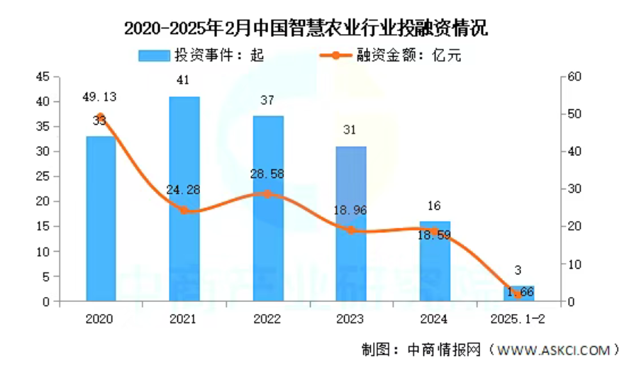 近年來,中國智慧農業行業投資事件數量及規模整體呈波動上升趨勢。IT桔子數據顯示,2024年我國智慧農業投資數量16起,已披露融資金額達18.59億元。2025年1-2月我國智慧農業投資數量3起,已披露融資金額達1.66億元。