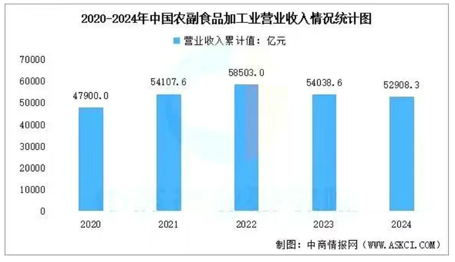 農副食品加工業是農業產業鏈的重要環節,中國已成為全球最大的農產品加工市場之一。2024年中國農副食品加工業營業收入累計達到52908.3億元。