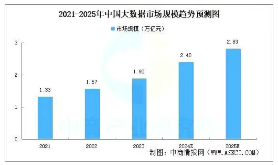 伴隨著數據產量的高速增長,國內大數據產業規模大幅提升,成為推動數字經濟發展的重要力量。2023年中國大數據產業規模為1.9萬億元,較上年增長21.02%,2024年市場規模達到約2.4萬億元,預計2025年中國大數據產業規模將進一步增至2.83萬億元。