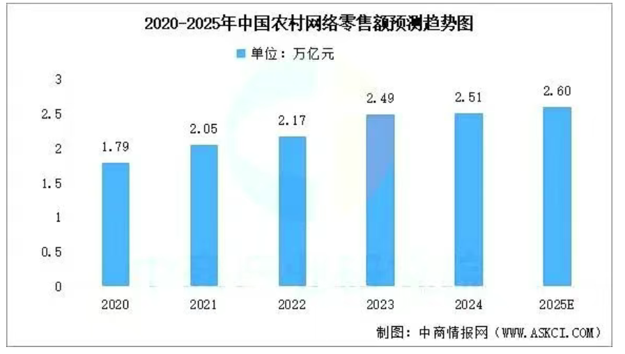 近年來,中國農村電商市場蓬勃發展,農業農村部數據顯示,2023年中國農村網絡零售額達2.49萬億元,同比增長12.9%。預計2025年中國農村網絡零售額將達到2.6萬億元。