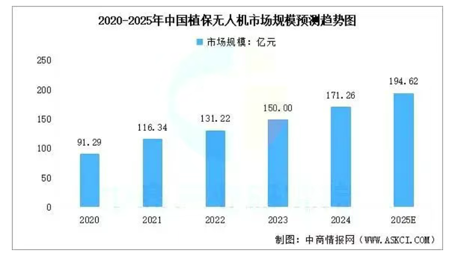 2023年中國植保無人機市場規模達150億元,預計2025年將達194.62億元。