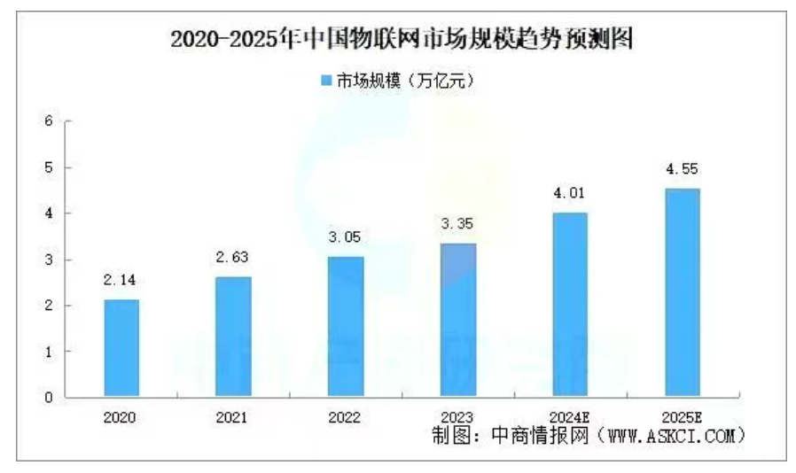 物聯網是以感知技術和網絡通信技術為主要手段,實現人、機、物的泛在連接,提供信息感知、信息傳輸、信息處理等服務的基礎設施。2023年全國物聯網市場規模約為3.35萬億元,同比增長9.84%,2024年市場規模約4.01萬億元。未來,物聯網上漲空間可觀,中商產業研究院分析師預測,2025年全國物聯網市場規模可達4.55萬億元。