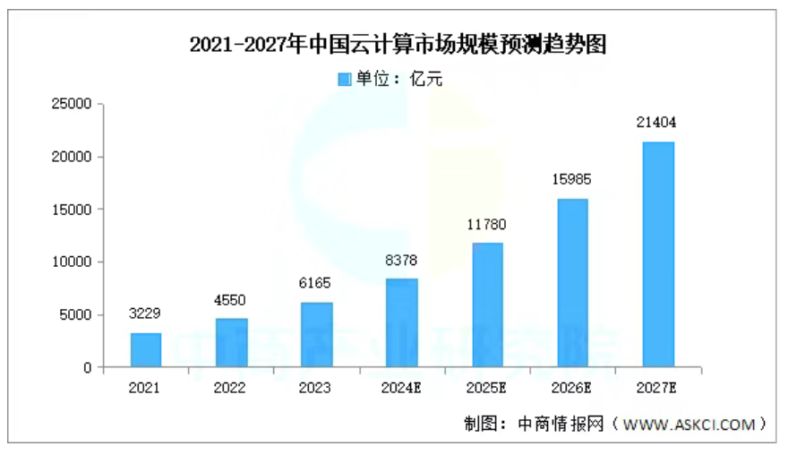 2023年我國云計算市場規模達6165億元,較2022年增長35.5%,大幅高于全球增速。隨著AI原生帶來的云計算技術革新以及大模型規模化應用落地,我國云計算產業發展將迎來新一輪增長曲線,預計2025年市場規模將達1.18萬億元,2027年將超過2.1萬億元。