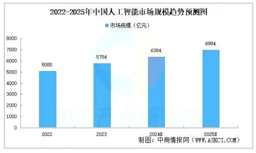 我國初步構建了較為全面的人工智能產業體系。2023年中國人工智能市場規模達到5784億元,增速放緩至13.9%,2024年市場規模約為6384億元。未來大模型帶來的底層技術革新將為中國人工智能產業的規模增長帶來更多存量擴張與增量空間,預計2025年中國人工智能市場規模將逼近7000億元。