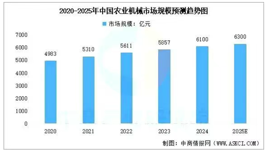 農業機械是指在作物種植業和畜牧業生產過程中,以及農、畜產品初加工和處理過程中所使用的各種機械。中國農業機械市場規模在逐年增長,為智慧農業提供了重要的硬件支持。2023年中國農業機械行業市場規模達5857億元,同比增長4.38%,2024年市場規模約為6100億元,預計2025年將增長至6300億元。