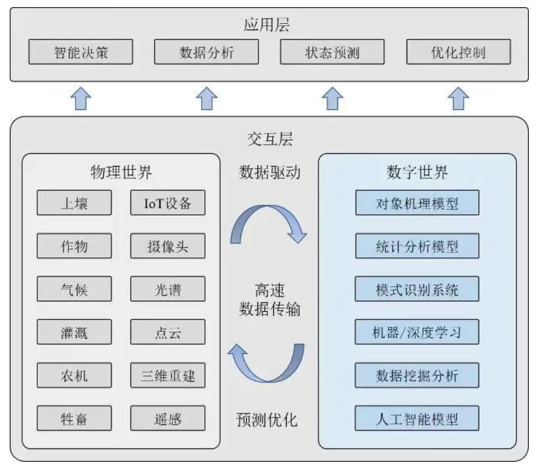 農業數字孿生和平行農業有相同之處但也存在側重點的區別。農業數字孿生和平行農業均為解決信息、物理、社會融合這一科學問題提供了新的解決思路,且兩者都與先進傳感采集、仿真、高性能計算、智能算法等的發展有著密不可分的關系。農業數字孿生系統側重于針對機理明確的農業系統,構建農業數字孿生系統通常需要人工構建的虛擬農業系統和實際物理農業系統在狀態轉換、觀測、控制的機理上相互對應。而平行農業可以對尚未明確機理的復雜農業系統做出構建和解釋。