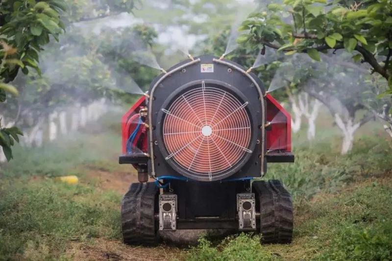 因為有遙感無人機采集的果樹定位信息,農業無人機和無人車都能對病蟲害發生的區域進行精準的噴灑。在地面,農業無人車行進在高低不平的果園中,氣流噴射霧炮將藥液從下往上噴灑,穿透樹葉。在空中,無人機將藥液霧化成微米級顆粒,可以節省30%農藥化肥和近90%的噴灑用水。這樣一來,不僅減少了拉管子打藥的人工,還不用給果樹“洗澡式”打藥,避免環境污染,并且極大降低人的中毒風險。