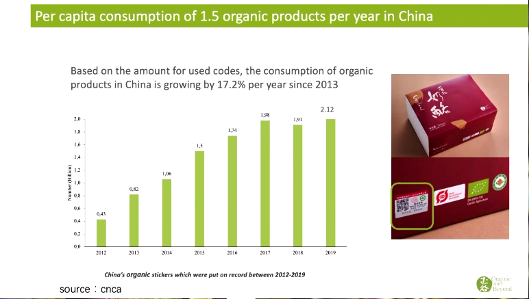 圖. 根據有機碼使用數量統計,2013年至2019年,中國有機產品的消費市場平均每年保持17.2%的增長,其中2019年共使用21.2億枚有機碼。