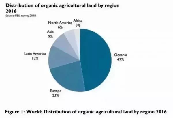 根據(jù)FiBL-IFOAM(瑞士有機農(nóng)業(yè)研究所-國際有機聯(lián)盟)在2018年5月發(fā)布的《2018年世界有機農(nóng)業(yè)概況與趨勢預(yù)測》顯示,2016年,以有機方式管理的農(nóng)地面積為5780萬公頃(8.67億畝,包括處于轉(zhuǎn)換期的土地)。有機農(nóng)地面積最大的兩個洲分別是大洋洲(2730萬公頃,約占世界有機農(nóng)地面積的一半)