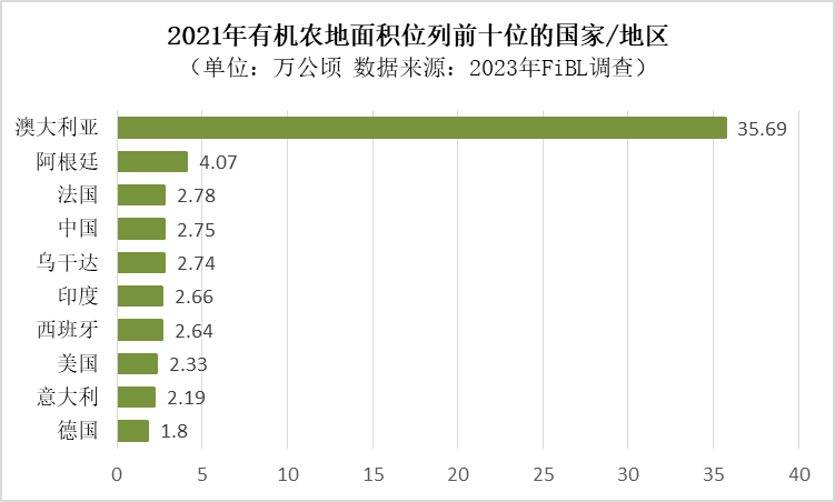 世界上有機農地面積最大的3個國家分別為澳大利亞(3570萬公頃)、阿根廷(410萬公頃)和法國(278萬公頃)。中國僅次于法國,排名第四(275萬公頃)。