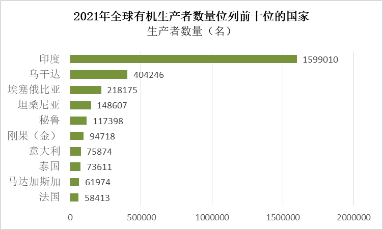 2021年,全球至少有370萬有機生產者。其中,49%的有機生產者分布在亞洲,其次是非洲(31%),歐洲(12%)和拉丁美洲(8%)。有機生產者最多的國家是印度(1599010名)、烏干達(404246名)和埃塞俄比亞(218175名)。