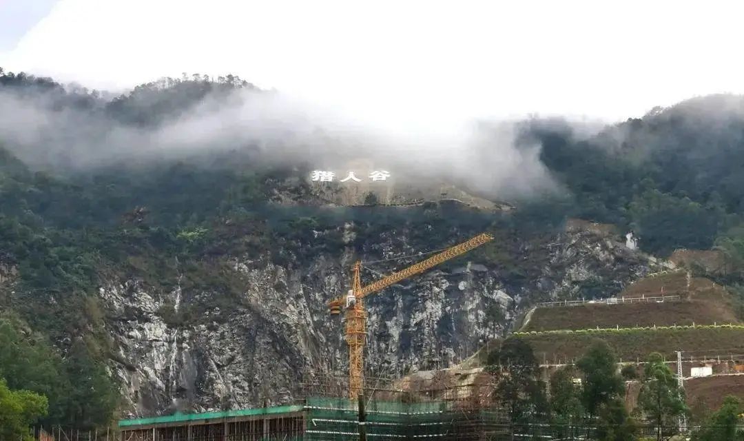 在獵人谷高處遠眺谷底,幾輛拖拉機正在烈日下工作。據悉,這里將包括 " 黃山景色 "、" 歐洲城堡 "、" 摩崖石刻 "、" 匠心湖 " 等景點,目前正在清理匠心湖湖底。"