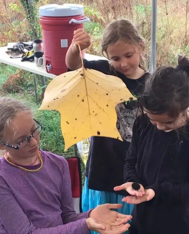孩子們?cè)谟^察研究一只帶刺的毛毛蟲
