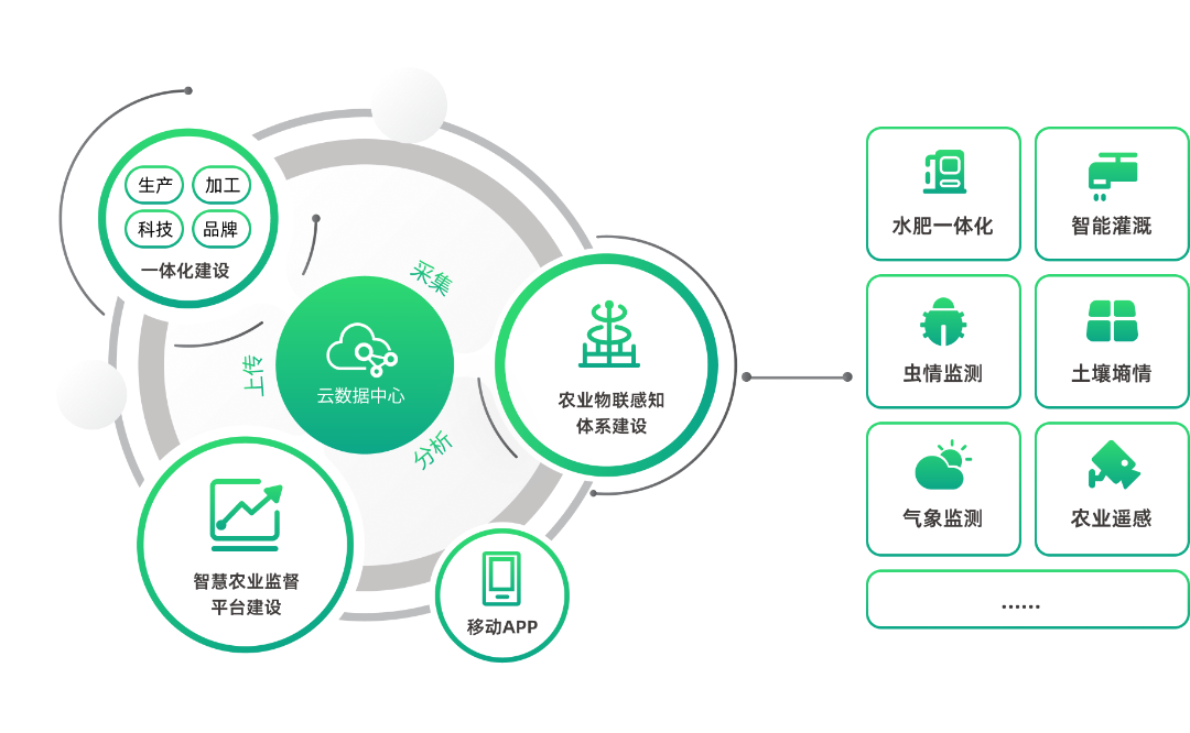 依托農業產業特色,設計“1+4+N+1”框架內容,打通全產業信息鏈,實現農業數據智能采集、互聯共享、智能分析和智慧應用,推動農業數字化、智能化管理及“生產+加工+科技+品牌”一體化發展。