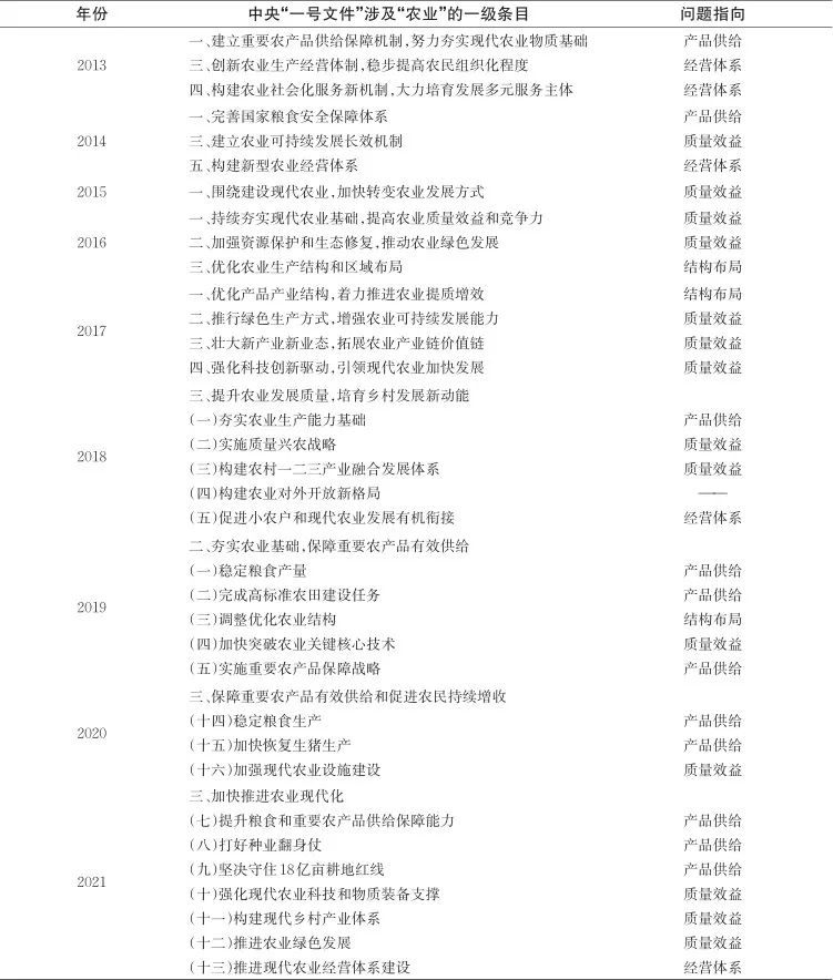 基于該思路,本文首先篩選新時代以來歷年中央“一號文件”關于“農(nóng)業(yè)”論述的一級或二級條目。篩選“農(nóng)業(yè)”而非“農(nóng)村”“農(nóng)民”的考慮是,雖然“三農(nóng)”是一個有機整體,“農(nóng)村”“農(nóng)民”同“農(nóng)業(yè)高質(zhì)量發(fā)展”密不可分,但僅篩選“農(nóng)業(yè)”條目能在有限篇幅內(nèi)降低研究難度,也能有效避免過度擴大“農(nóng)業(yè)高質(zhì)量發(fā)展”的內(nèi)涵和外延。篩選一級或二級條目的原因是,中央“一號文件”每個條目均具有較為清晰的問題指向,條目所包含的文本均是圍繞該條目進行具體論述。之后,基于篩選的條目,總結(jié)提煉該條目的問題指向。最后,基于總結(jié)提煉的問題指向,歸納農(nóng)業(yè)高質(zhì)量發(fā)展的深層內(nèi)涵(見表1)。
