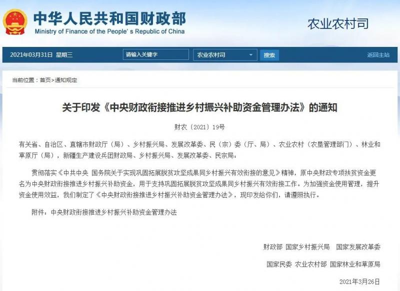 中央財(cái)政銜接推進(jìn)鄉(xiāng)村振興補(bǔ)助資金管理辦法