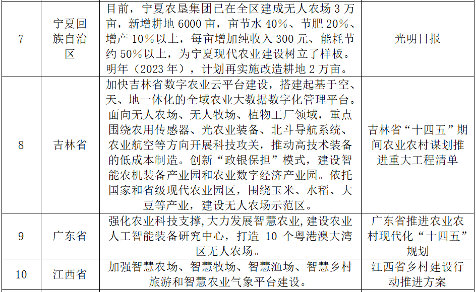 除此之外,江蘇無錫市、上海嘉定區、北京海淀區、浙江嘉興市、四川成都市、安徽亳州市、廣西馬山縣、湖南長沙市、河南鄧州市、山東淄博市等100多個縣市區積極加碼無人農場。