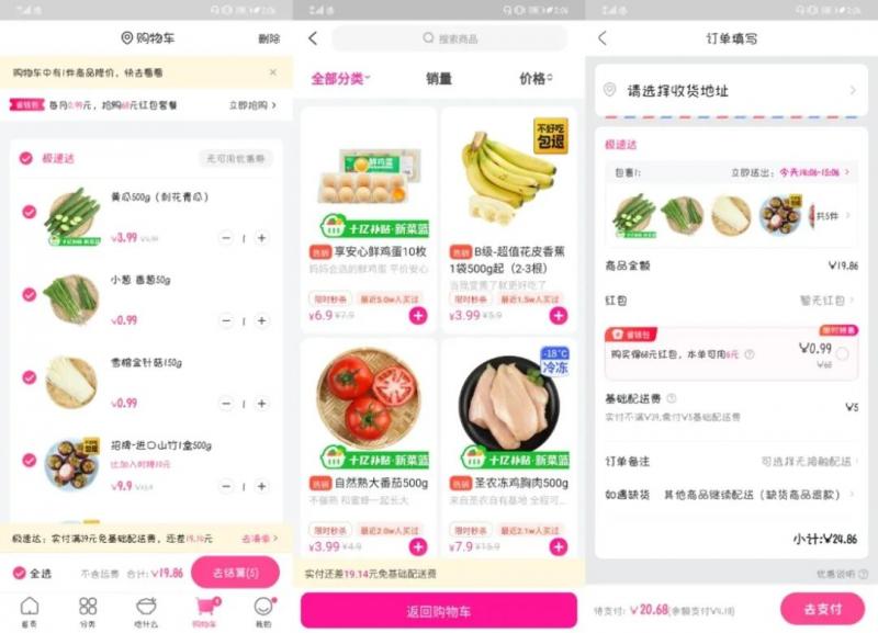 整個界面設計比較簡潔,讓人一目了然,在上部提供了購買紅包的鏈接,能在結算前讓用戶迅參與紅包優惠活動,滿39元享受免基礎配送費服務,勾選商品后自動計算總價及還差多少金額達到包郵金額,點擊“去湊單”后可以看到很多低價商品,可按照關鍵字搜索或按種類進行篩選,幫助用戶快速湊單。