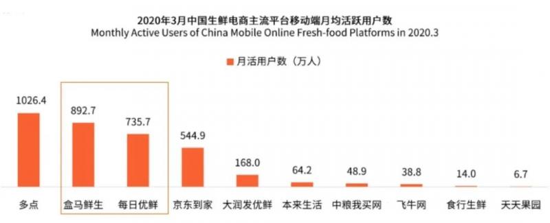 根據艾媒咨詢數據顯示,截至2020年3月盒馬鮮生的月活用戶數達到892.7萬人,每日優鮮月活用戶數達到735.7萬人,疫情期間大眾對在線生鮮商品的采購需求有效提高,各平臺在疫情期間均保持了較高的用戶增速。