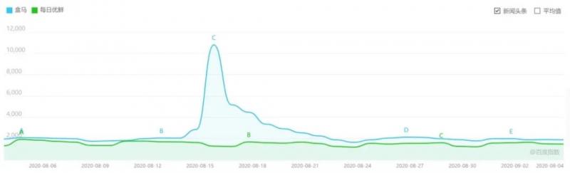總體上二者搜索量大致相同,盒馬鮮生的搜索指數稍顯優勢。