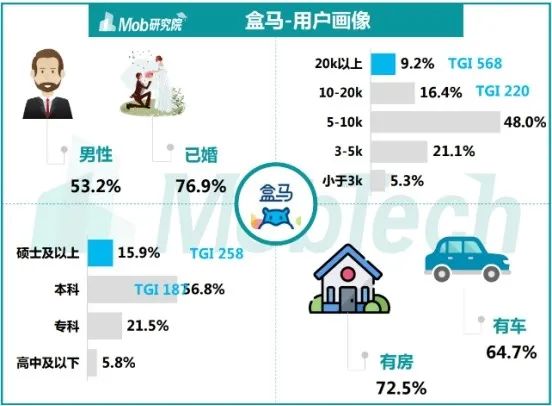 盒馬鮮生的用戶中典型用戶為一二線城市的精英人群,男性用戶占比達到53.2%,有76.9%的用戶為已婚狀態,其主要特點是高收入,高學歷,有房有車,他們大多對生活品質有較高追求,購買力水平較高,更注重生鮮產品的質量,而對價格并不敏感。